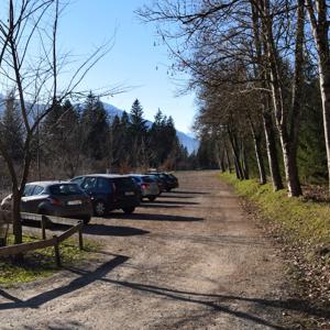 Autobahn A 12, Abfahrt Hall in Tirol und dann weiter Richtung Absam und Gnadenwald. Nach dem Ortsende von Absam ca. 300 m links großer Schotterparkplatz. Unmittelbar in der Nähe (links) Zufahrt zu Parkmöglichkeiten im Wald (Sprungschanze).