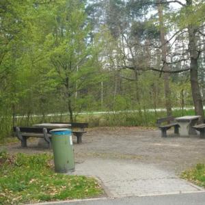 Es sind Sitzgelegenheiten, Tische und Abfalleimer vorhanden.
