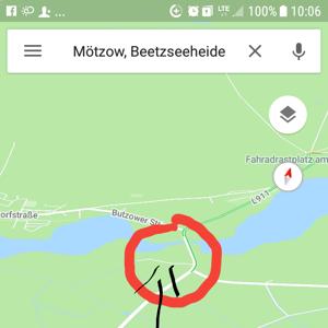 Aus Brandenburg komment die L911 Richtung Radewege, Päwesin... fahren, durch den Ort Mötzow durch etwa 2km der Straße folgen dann kommt ein Abzweig Richtung Grabow (den nicht fahren) und 100m danach geht ein etwas größerer Wald