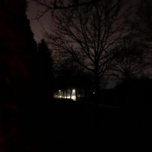 Der Parkplatz ist dunkel, hat einzelne Parkbuchten.