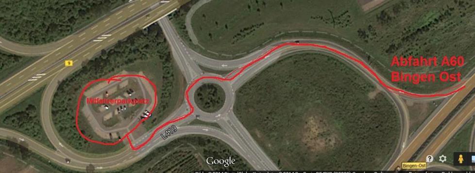 Autobahnabfahrt A60 Fahrtrichtung Bingen Ost. Über den Kreisel fahren und auf der rechten Seite findet man den Parkplatz. Bevorzugt sind die hinteren Plätze