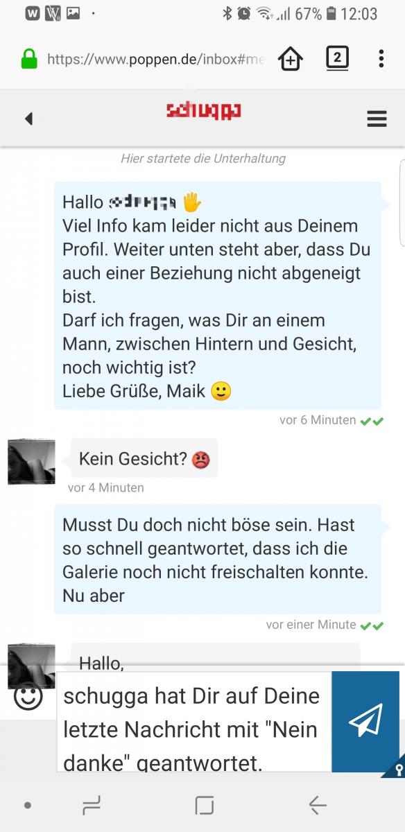 ku**** Geschrieben März 1, 2018 (bearbeitet) Ganz klassische Unterhaltung. 👇 👆 soviel dann zum Thema Respekt und Niveau. Wird so oft von den Damen eingefordert und dann von eben jenen auch ganz schnell wieder vergessen. ManN soll die Damen nicht zum Objekt degradieren, auf sie eingehen eingehen und für alles Mögliche Verständnis zeigen, während Frau sich hier benimmt, wie die Axt im Walde. Fängt mit Profilen an, in denen sich Madame nicht ansatzweise die Mühe macht auch nur ein Wort zu schreiben, Bilder die ausser Füssen und Landschaften nichts zeigen (aber ohne Gesichtsbild gibt's dann keine Antwort), bis hin zu übelsten Pöbeleien und Beschimpfungen, rein prophylaktisch, an Unbekannt gerichtet (soll dann wahrscheinlich Selbstbewusstsein ausdrücken). Liebe Damen 👉 SO sieht Emanzipation nicht aus. Hier wird heutzutage nur noch Rollentausch betrieben. Ich picke mir die Rosinen und dem Rest kotz' ich auf die Füße. Natürlich gibt's Idioten auf beider Seiten, doch solltet Ihr den Anspruch, den Ihr an uns Männer stellt, zumindest ansatzweise, auch mal selbst erfüllen Mit Eurem "Nein, Danke"-Gedrücke, sobald Ihr das Gesicht sehr, schickt Ihr unter anderem die Aussage: "Gott, ist der häßlich 😖" A- auf der Straße erlebe ich es anders B- Ihr möchtet anständig angeschrieben werden. Recht so. Aber wenn manN es dann tut, dürft Ihr auch gerne mal anständig absagen... bearbeitet März 1, 2018 von kushimo
