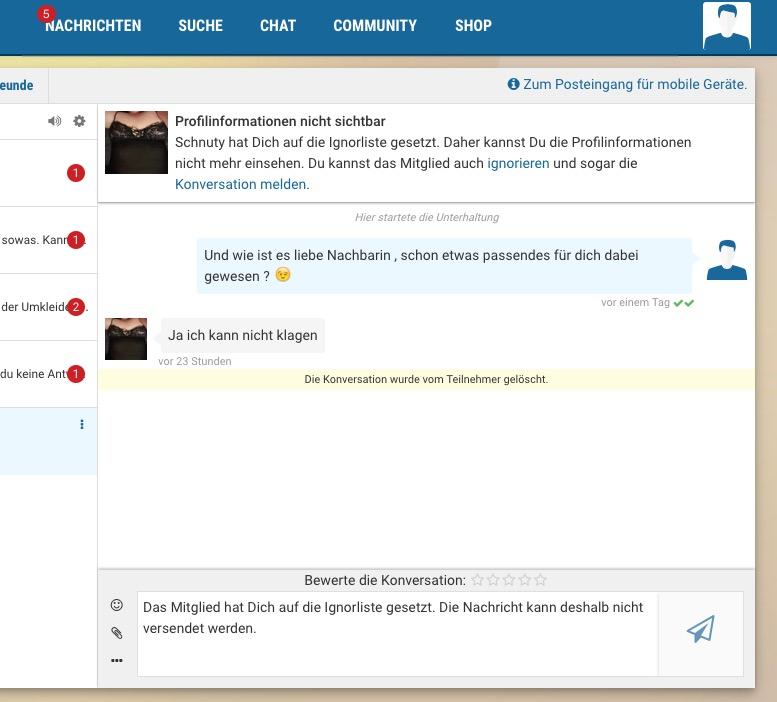 ....Ich hab grad eine recht nette erste Nachricht von einem Herren bekommen, und wollte antworten, aber da war ich schon auf seine Ignoreliste...