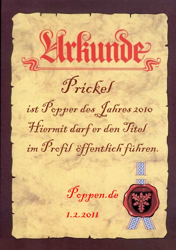 te**** Geschrieben Februar 1, 2011 ... so dass ich nun auch offiziell [SIZE=5]Prickel [/SIZE]zum Popper des Jahres 2010 ernennen darf! ... Herzlichen Glühstrumpf, Prickel!