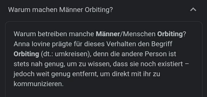 Ich bin scheinbar auf jeden Fall zu alt. Ich weiß nicht mal was „Orbiting, Gaslighting“ ist. Und nein, ich google nicht.