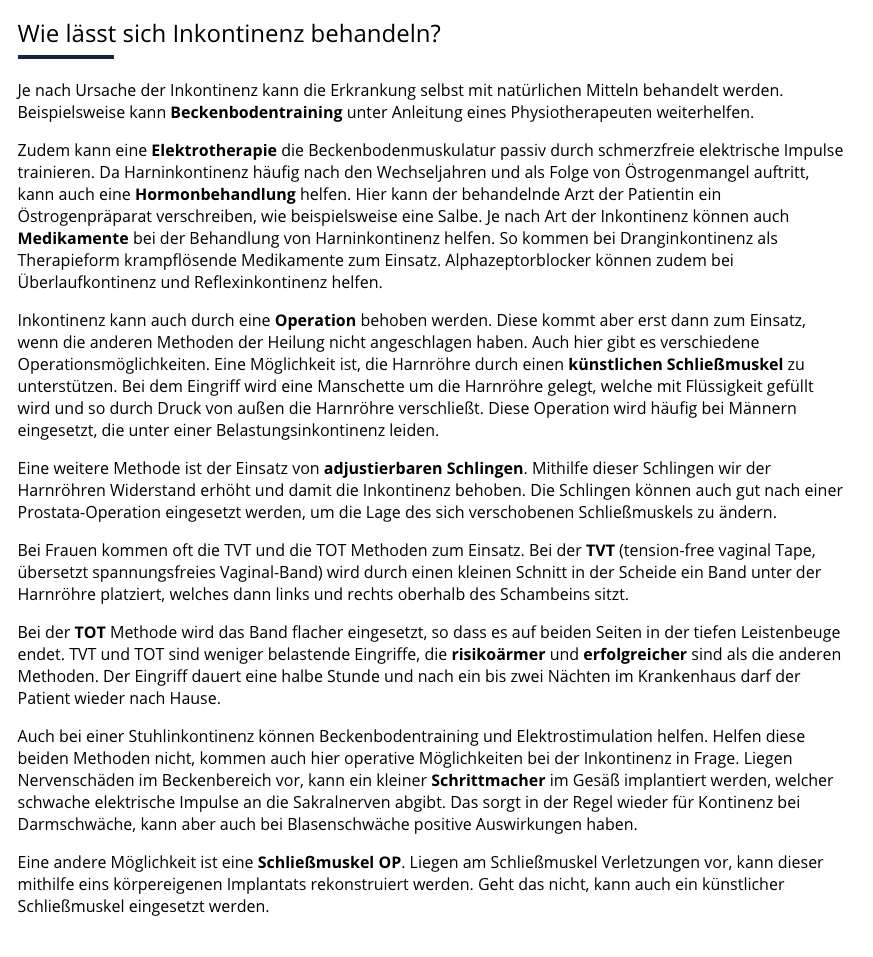 Offenbar gibt es, je nach Ursache und Form der Inkontinenz, diverse Lösungen. Siehe Anhänge. Zur Not auch den Arzt wechseln, wenn deiner dich dahingehend nicht gut beraten hat.