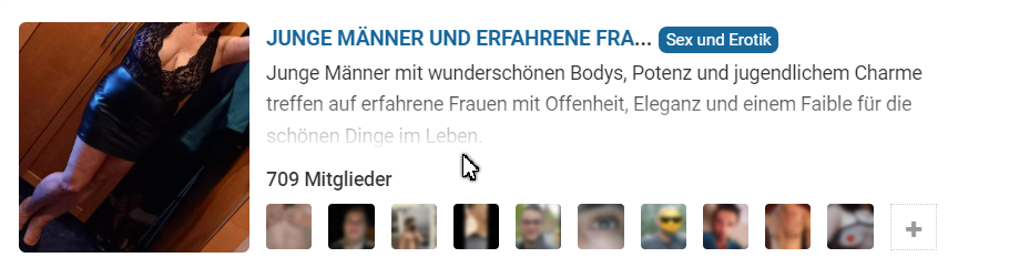 So falsch kann der junge Mann nicht liegen wenn unter unseren Gruppen eine ist die jetzt schon 709 Mitglieder hat. Also entweder gibt es viele Frauen die Junges Gemüse suchen oder Junge Männer die reifes suchen.