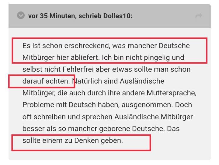 Es ist schon erschreckend, was mancher Deutsche Mitbürger hier abliefert. Ich bin nicht pingelig und selbst nicht Fehlerfrei aber etwas sollte man schon darauf achten. Natürlich sind Ausländische Mitbürger, die auch durch ihre andere Muttersprache, Probleme mit Deutsch haben, ausgenommen. Doch oft schreiben und sprechen Ausländische Mitbürger besser als so mancher geborene Deutsche. Das sollte einem zu Denken geben.