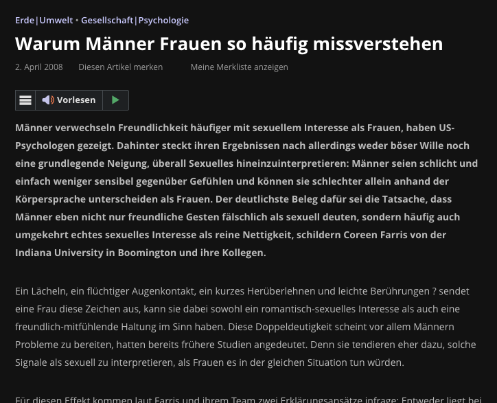 Bist ja auch ein Mann und musst dich nicht jahrzehntelang bei jeder Gelegenheit draußen anquatschen lassen, ob du Bock auf Date oder Sex hast, nur weil du mal freundlich lächelst oder irgendeine allgemeine Info gibst. Du kannst das also nicht beurteilen und musst uns Frauen auch nicht überheblich und frauenfeindlich belächeln. Und nur weil DU nicht Lächeln erwähnt hast, kann man doch als Frau das Beispiel nennen, dass selbst ein Lächeln Mal falsch interpretiert wurde. Jetzt verständlicher für dich?