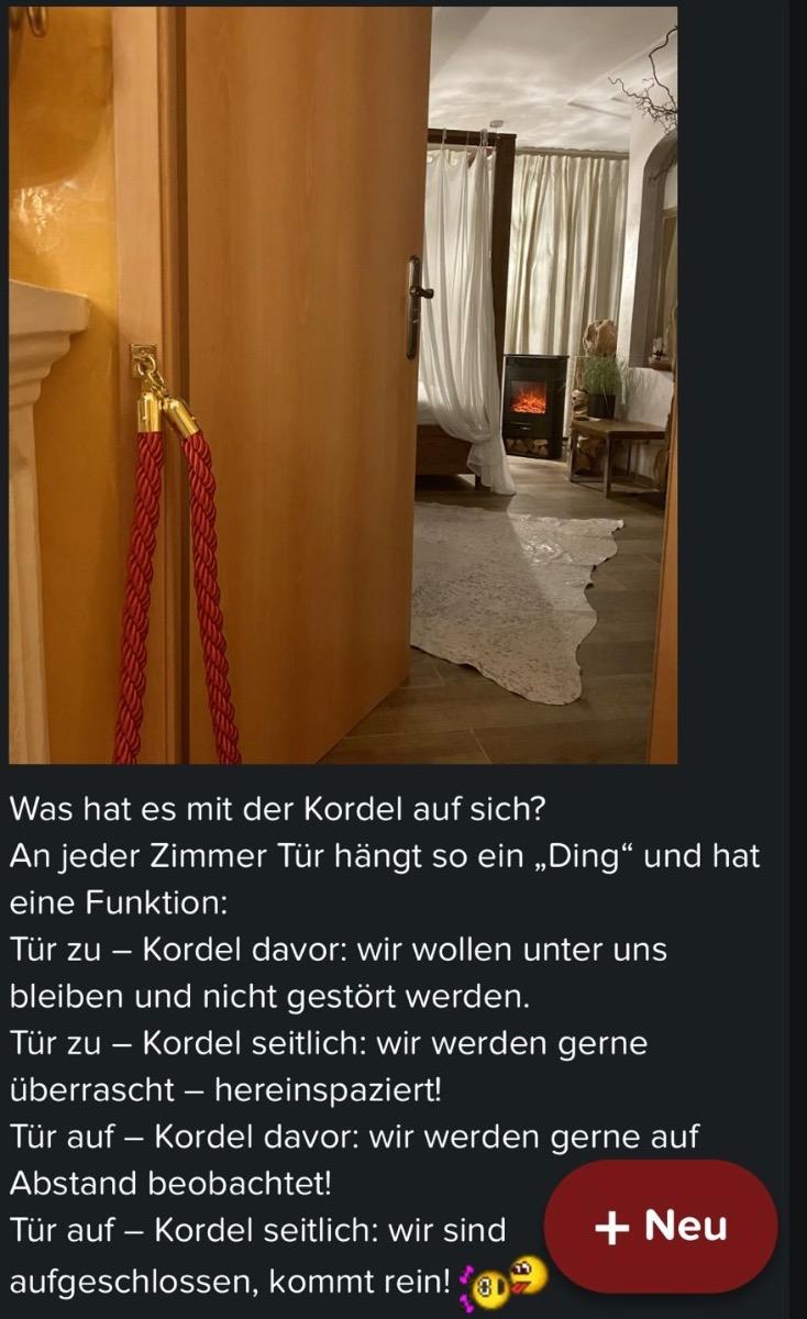 Di**** Geschrieben August 28, 2023 vor 21 Stunden, schrieb Zimtschnecke6969: Waren noch nie in einem SC, allerdings geht da höchstwahrscheinlich anders zu als im Hotel. Im Hotel gibt es vor den Themenzimmern Kordeln. Ähnlich wie in einem VIP-Bereich in der Disko „regelt“ das dort den Zutritt. Präziser (wie im Bild zu sehen): - Kordel zu, Türe zu: wir wollen ungestört sein - Kordel zu, Türe auf: zuschauen ja, mitmachen nein - Kordel weg, Türe zu: wir werden gerne überrascht, komm doch rein - Kordel weg, Türe auf: schau zu und wenn die gefällt was du siehst bist du herzlich eingeladen Allerdings ist es identisch zum SC/Pärchenabend im PK: ein Nein ist ein Nein, keine Diskussion, keine Bettelei! Ich hoffe, die Erklärung hat geholfen?! WARUM EINFACH WENNS AUCH KOMPLIZIERT GEHT...