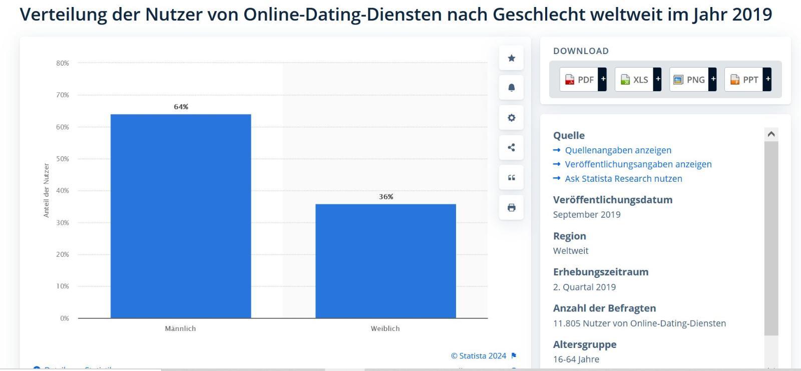 In Deutschland 2022 das Gleiche : Diese Statistik bildet das Ergebnis einer Umfrage zur Nutzung von Online-Dating-Diensten in Deutschland nach Geschlecht im Jahr 2022 ab. Dabei gaben rund 34 Prozent der weiblichen Internetnutzer an, Online-Dating-Dienste zu nutzen.-