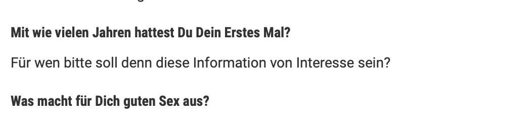 „Ein Teil dieser Antworten würde die Bevölkerung verunsichern“, darum antworte ich mal genauso nichtssagend wie du. Ich habe meine erste sexuelle Erfahrung bereits vor einiger Zeit gemacht und mache bisher mit jeder neuen Partnerin neue erste sexuelle Erfahrungen.