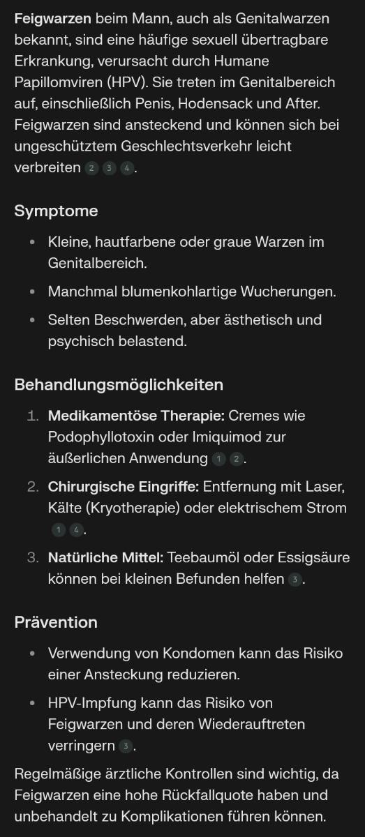 Dr**** Geschrieben November 6, 2024 vor 6 Minuten, schrieb Johndillemen: Es geht nicht um Warzen beim Mann. M/W/D sind davon betroffen. Beim Mann fällt es vielleicht eher auf? Es braucht auch keinen promiskuitiven Lebensstil um sich welche zu holen. Klar, ist ja ansteckend. Ja, Feigwarzen können auch bei Frauen auftreten. Sie sind gutartige Hautwucherungen, die durch das humane Papillomavirus (HPV) verursacht werden und im Genitalbereich vorkommen. Bei Frauen treten sie häufig an den Schamlippen, in der Scheide, am Scheideneingang, am After und manchmal auch am Gebärmutterhals auf[1][2][3]. Diese Warzen sind eine der häufigsten sexuell übertragbaren Krankheiten und können durch engen Hautkontakt, meist beim Geschlechtsverkehr, übertragen werden[4][5]. Divers ist kein Geschlecht. Daher auch da bei m/w nachzulesen. Quellen: [1]entschiedengegenkrebs/erkrankungen/feigwarzen-genitalwarzen/ [2]doktorabc/geschlechtskrankheiten/genitalwarzen/diagnose [3] barmer/gesundheit-verstehen/wissen/krankheiten-a-z/feigwarzen-1238734 [4]fernarzt/krankheiten/genitalwarzen/behandlung/feigwarzen-bei-der-frau/ [5] aidshilfe/feigwarzen-hpv [6] usz ch/krankheit/feigwarzen/ [7] netdoktor/krankheiten/hpv/feigwarzen/