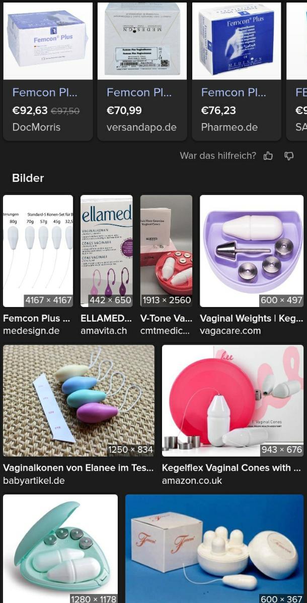 Erklärung: Vaginalkonen sind kleine, konisch geformte Gewichte, die zur Stärkung und zum Training der Beckenbodenmuskulatur bei Frauen eingesetzt werden. Sie werden ähnlich wie ein Tampon in die Vagina eingeführt und bleiben dort während des Trainings für einige Minuten.