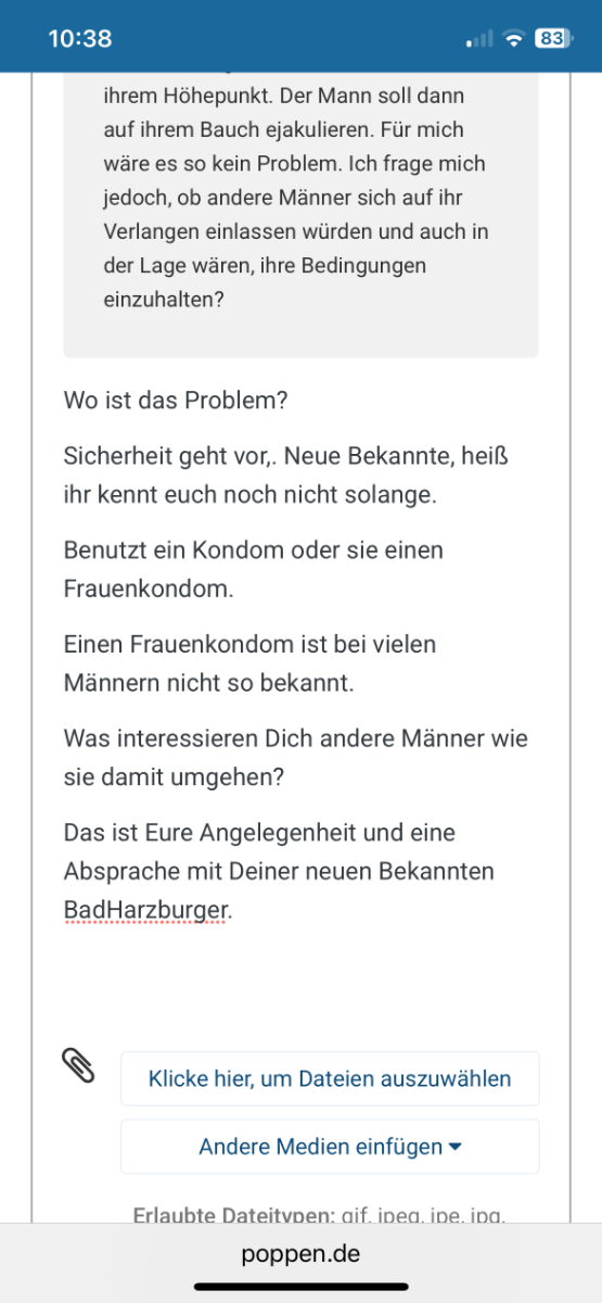 Eine neue Bekannte möchte Sex aber nur als Coitus Interruptus. Sie mag kein Sperma in ihrer Vagina. Erwartet jedoch ausdauernd gefickt zu werden bis zu ihrem Höhepunkt. Der Mann soll dann auf ihrem Bauch ejakulieren. Für mich wäre es so kein Problem. Ich frage mich jedoch, ob andere Männer sich auf ihr Verlangen einlassen würden und auch in der Lage wären, ihre Bedingungen einzuhalten?