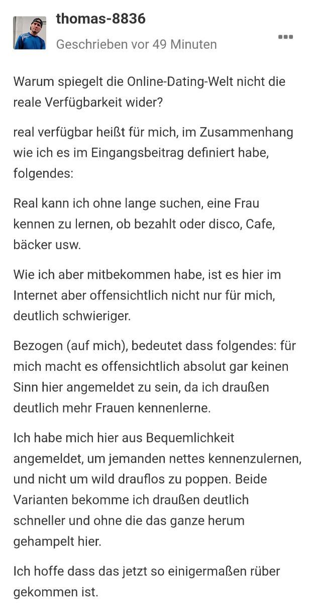 Bo**** Geschrieben vor 8 Stunden vor 8 Minuten, schrieb thomas-8836: Ja, das hatte ich ja eigentlich auch vor, aber ich hatte ja keine Ahnung, welches Ausmaß das hier annimmt. Aber ich denke ich habe auf .S10 das Jetzt geklärt mit der Frage? Und für mich wird das hier echt zu unübersichtlich, deshalb die spontane Idee mit dem Anschreiben, ist aber natürlich auch Blödsinn, sorry Und ihr seid auch viel zu schnell, oder ich zu langsam, hab ich eine Beitrag fertig kommen 4 neue. Argh Für mein Empfinden gibt's du dir viel Mühe, nur hast du scheinbar einige Verständnisprobleme, was aber definitiv nicht ausschließlich an dir liegt. vor 41 Minuten, schrieb thomas-8836: Warum spiegelt die Online-Dating-Welt nicht die reale Verfügbarkeit wider? real verfügbar heißt für mich, im Zusammenhang wie ich es im Eingangsbeitrag definiert habe, folgendes: Real kann ich ohne lange suchen, eine Frau kennen zu lernen, ob bezahlt oder disco, Cafe, bäcker usw. Wie ich aber mitbekommen habe, ist es hier im Internet aber offensichtlich nicht nur für mich, deutlich schwieriger. Bezogen (auf mich), bedeutet dass folgendes: für mich macht es offensichtlich absolut gar keinen Sinn hier angemeldet zu sein, da ich draußen deutlich mehr Frauen kennenlerne. Ich habe mich hier aus Bequemlichkeit angemeldet, um jemanden nettes kennenzulernen, und nicht um wild drauflos zu poppen. Beide Varianten bekomme ich draußen deutlich schneller und ohne die das ganze herum gehampelt hier. Ich hoffe dass das jetzt so einigermaßen rüber gekommen ist. Und ich habe auch aktuell keinen Partner und Lüge auch nicht! Das muss immer wieder nach oben gebracht werden, damit alle anderen deine Bemühungen erkennen. 🍀
